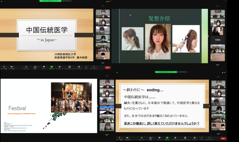 日方同学有的用日语,有的用中文,有的用英语,分别介绍了日本景点、大学生的日常生活、日本的女大学生、Covid-19对日本的影响、针灸和中医在日本的普及、日本的节日、音乐和体育运动。我校学生认真听取了日本同学的交流,虽然是通过ZOOM会议室的线上交流,依然表现出健康学子文明有礼的风范,每名同学发表结束后,同学们都以掌声表示感谢,并且使用流利的日语或英语在提问环节中表现出色。