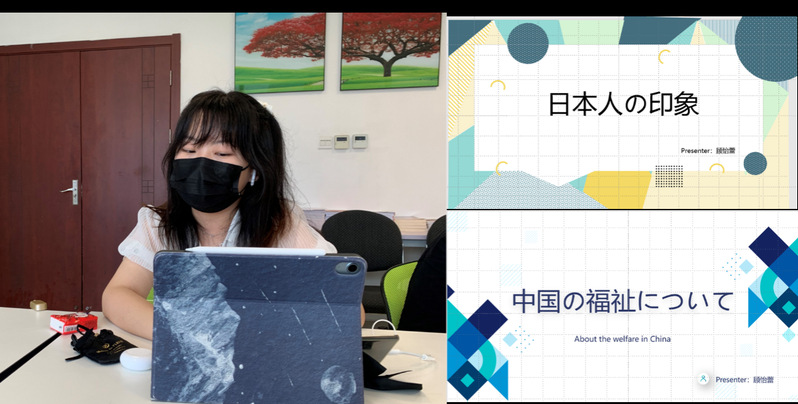 正式的线上交流活动于9月正式举行。从热情洋溢的自我介绍开始,同学们用日语线上交流,分别用PPT展示的形式对日本同学感兴趣的话题展开热烈讨论。我校同学介绍了上海、上海健康医学院概况和引以自豪的学校国际交流情况。交流讨论延伸到同学们的大学生活、考试评价、对日本的印象、中国的社会福利制度。代表学校进行PPT展示的6位同学以流畅的日语表达征服听众,上健医学子的阳光形象给日方师生留下深刻的印象。