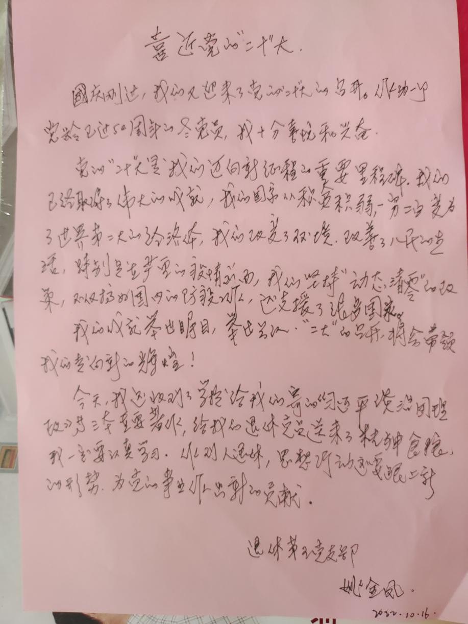 党的二十大终于在全体党员的热切期盼下胜利召开了!这次大会的召开,昭示着党开启了新的征程,在取得了辉煌的业绩后,踏上了新的赶考之路。在总结过去的成绩中,习近平总书记说到:经过不懈地努力,党找到了自我革命这一跳出治乱兴衰历史周期率的第二个答案,确保党永远不变质,不变色,不变味。这条成功的探索之道,是中国共产党人通过不懈努力获得的,是党的智慧结晶,通过自我革命保持党的先进性,是立党之本,兴党之源,是党永葆青春的基础。作为退休的党员,人虽然退休,但思想不能退休,要跟上时代的步伐,紧贴时代的脉搏,在新的赶考路上,尽心尽力,尽职尽责地发挥自己的余热,总结前进道路上的一切,以自己的经验教训,一则进一步完善自己,二则为青年教师、青年学子的成长,为培养合格的接班人而当好铺路石。