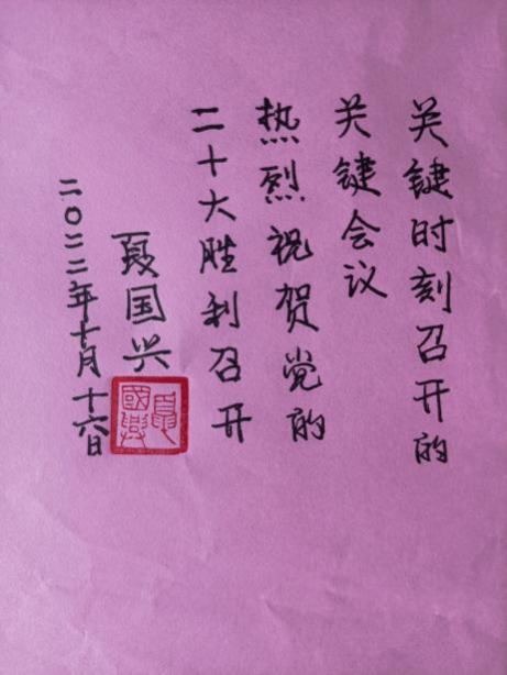 退休支部书记夏国兴用笔墨庆祝党的二十大召开。