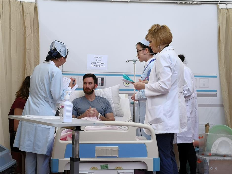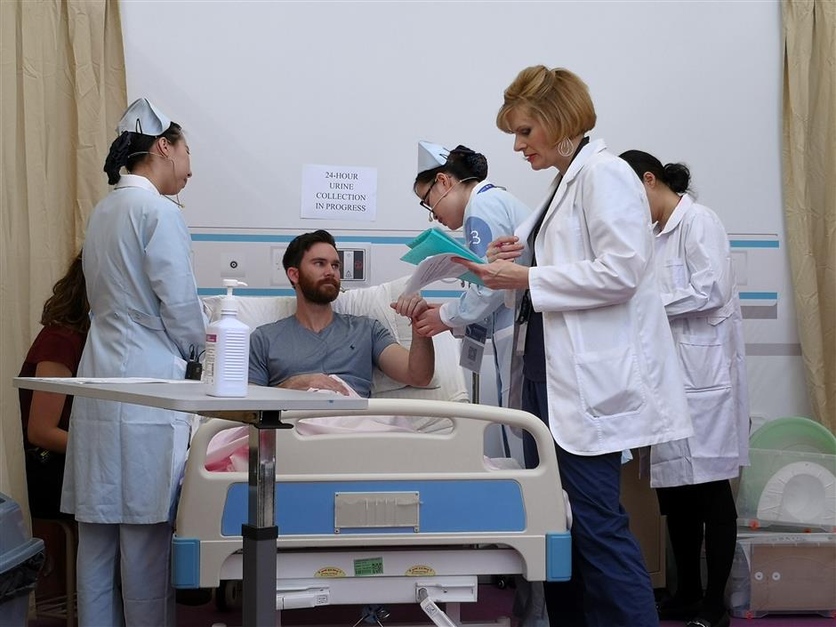 Two students from Shanghai University of Medicine and Health Sciences look after a patient with two judges observe from aside.