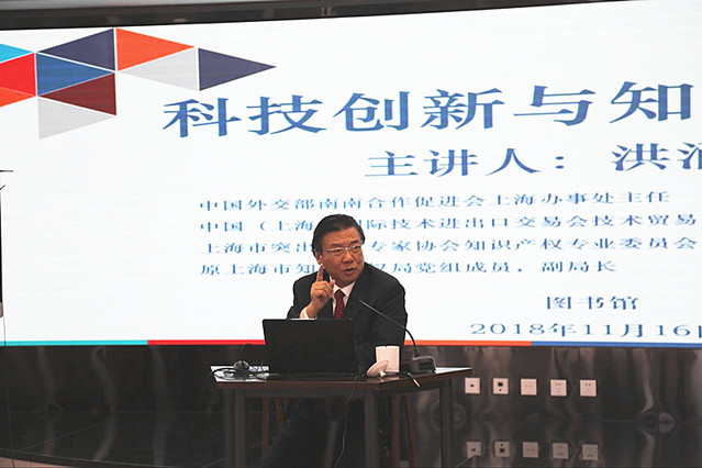 1116日下午,为普及知识产权知识,激发广大师生员工科研创新的积极性,图书馆邀请中国外交部南南合作促进会上海办事处主任、原上海市知识产权局党组成员,副局长洪涌清前来作“科技创新与知识产权”专题讲座。副校长唐红梅、图书馆馆长彭骏、副馆长俞凯君出席讲座。来自各部门、学院约40余名师生参加讲座。