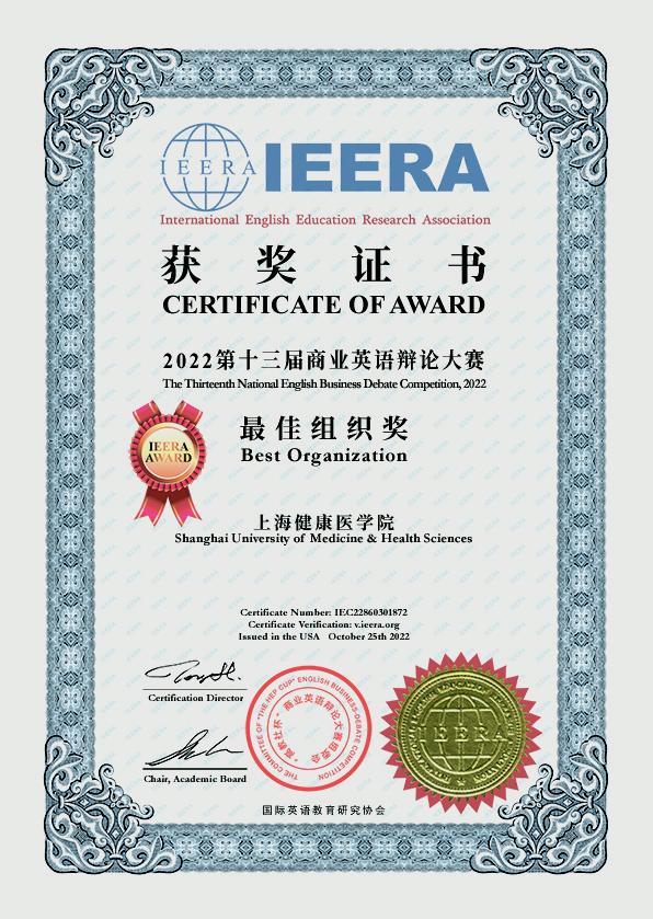 在2022年9月-10月举办的第十三届“高教社杯”商业英语辩论赛全国赛中,由我校护理与健康管理学院曾小桉、医疗器械学院陈晓月、何梦婷和医学技术学院姚紫涵组成的上海健康医学院一队,由我校临床医学院陈玥佑、医学技术学院倪晨晔、康复学院王艺和临床医学院杨怿博组成的上海健康医学院二队分别获得全国总决赛二等奖、由医学影像学院富华宁、唐浩杰、卫彦超、徐浩鑫组成的三队获得全国总决赛三等奖,其中上海健康医学院二队同时获得首次设立的商业方案全国创意金奖,外语教学部李悦、赵学旻、张捷、阮俊斌、陆懿媛等老师分别获得指导教师奖,学校获得优秀组织奖。