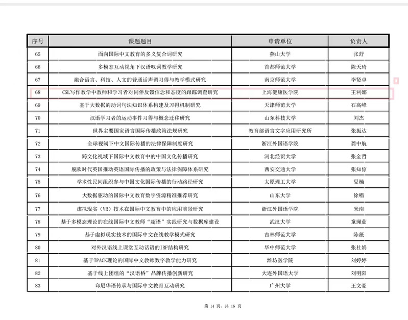 10月24日,2022年国际中文教育研究课题立项名单公示。我校外语教学部王利娜老师主持的“CSL写作教学中教师和学习者对同伴反馈信念和态度的跟踪调查研究”获批青年项目立项。这是我校首次获批教育部中外语言交流合作中心课题立项,是外语教学部学科建设近期工作的成果体现。