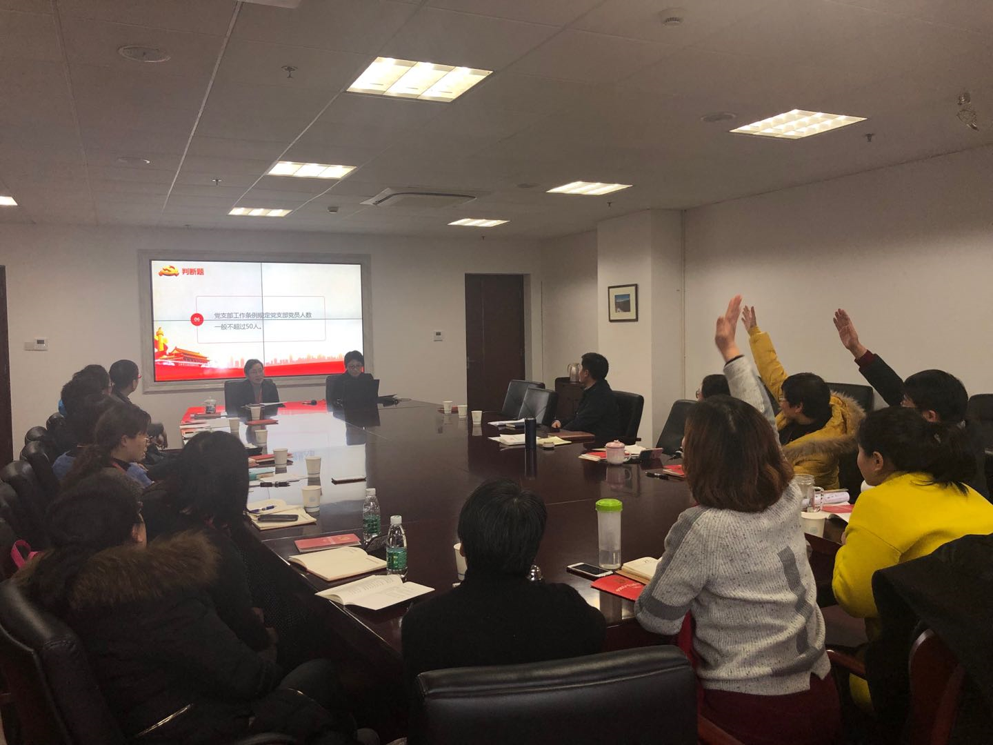 本次主题教育月活动分为三个环节:自学环节、聆听辅导报告环节和现场交流竞赛环节。为便于党员自学,党支部在月初给每位党员配发“两部条例”。12月17日,利用学校党委中心组扩大学习,组织全体党员聆听了上海市委党校袁峰教授的专题辅导报告《最新党规解读》。为了检验党员的学习效果,党支部于12月27日开展了学习成果交流和知识竞赛。在学习成果交流环节,支部党员郑沈芳、郑学文、施奇、蒋瑛英、陈国庆、杨雯等同志结合各自岗位,交流了学习体悟和思考。在知识竞赛环节,支部书记郑学文设置了判断题和简答题两种题型,采用举手抢答的形式,组织全体党员竞相答题。现场抢答踊跃,气氛活泼,蒋瑛英、施奇、解晓峰三位党员表现出色,获得前三名。