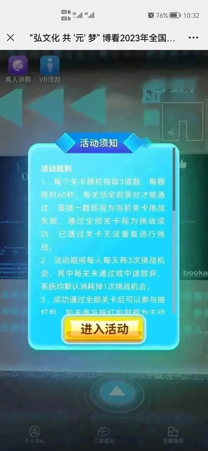 6、通关后参与抽红包,系统将即时显示中奖结果,有概率抽中随机微信红包。活动期间,还可点击顶部“VR漫游”,进入元宇宙空间参观体验!