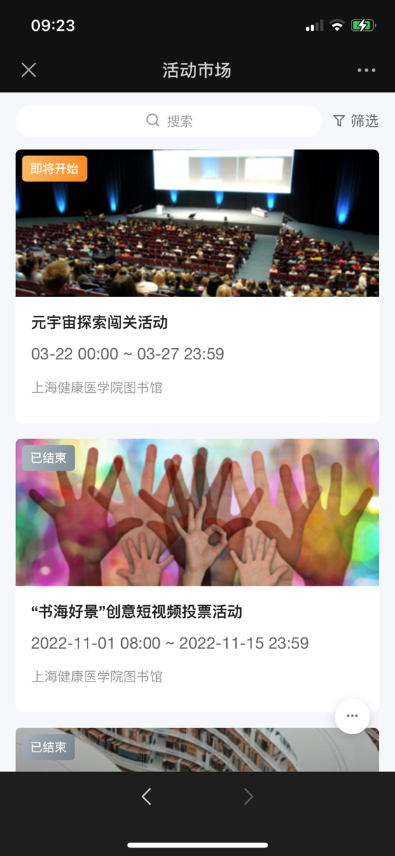 1、关注“上海健康医学院图书馆”公众号,点击菜单底部“悦读润道——阅读活动”,进入活动市场;