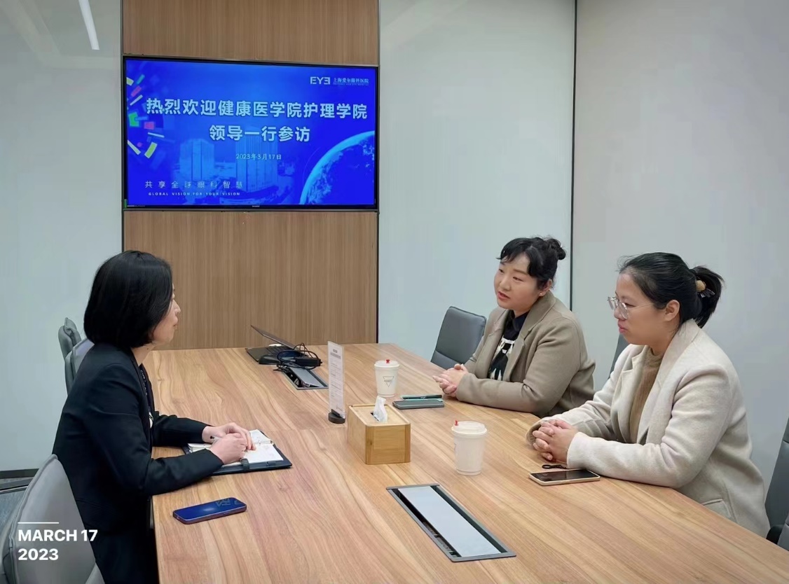 3月17日,上海健康医学院护理与健康管理学院党总支副书记薛文正和就业专员吉洁走访了上海爱尔眼科医院,与爱尔眼科医院的人事总监潘智莱进行了广泛交流。