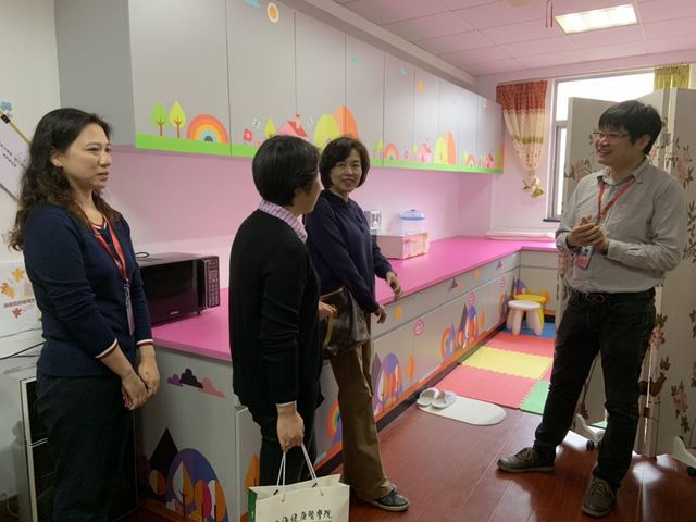 2019年5月15日上午,市总工会领导带领考核小组在校工会副主席芦静老师的陪同下到我校医学技术学院的“妈咪小屋”进行实地考核。医学技术学院党总支副书记高晓霞和学院工会主席陆俊杰老师为考核小组详细介绍了小屋的建设情况。