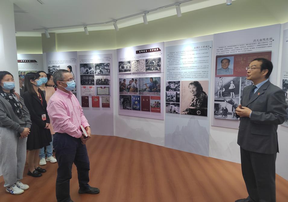 在参观主题展馆环节,耿铭以“赤诚之心、脚踏实地”“全力以赴、科业变革”“健节贤德、行不逾方”“康济无疆、民安物阜”四个篇章为序进行了讲解。他首先以消灭血吸虫病为例生动地讲述了新中国成立之初,在党的领导下医疗卫生事业所取得的伟大成就。又从“赤脚医生”的产生背景、做出的贡献、取得的成绩、形成的影响、体现的精神等多个方面,介绍了以赤脚医生为代表的广大基层医疗工作者在党和政府的正确领导下,奋发开拓、大爱奉献,为中国、为世界基层卫生事业贡献的一个又一个奇迹,并特别介绍了“中国赤脚医生第一人”王桂珍的生平事迹。随后,他从赤脚医生向全科医生的转型发展的过程、农村合作医疗制度的建立与变化、健康中国2030目标愿景出发,介绍了我国基层医疗卫生事业发展的光辉历程和中国共产党为了人民健康所做出的卓越成就,并结合我校的人才培养、创校历史的学习,激励全体党员教师自觉担当起培养更多具有“医者仁心、医技精湛、服务基层”的健康“守门人”责任,踔厉奋发,勇毅前行。
