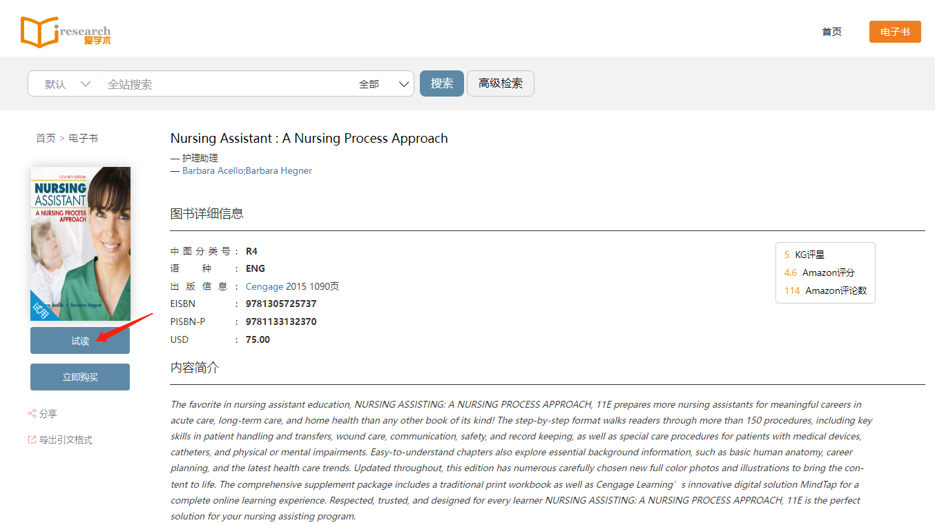 图书馆积极开拓各类优质数字资源,即日起Iresearch(爱学术)电子书数据库为我校开通961本护理学学科相关电子书全文阅读试用,试用期间读者可在线阅读全本电子书(无法下载),欢迎广大师生积极使用并多提宝贵意见。