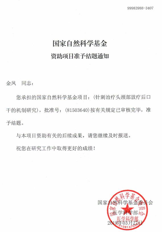 针刺治疗头颈部放疗后口干的机制研究项目解释了“针刺有效信息通过复杂网络调节相关受体和生长因子来治疗头颈部放疗后口干”这一关键科学问题,为针刺治疗头颈部放疗后口干提供理论依据。率先阐明针刺治疗头颈部放疗后口干的分子机制,为临床治疗提供理论依据,使针刺疗效得以科学的认识,取到国际认同。同时,实验结果有效指导临床,明确针刺在何种放疗方式下发挥最佳的疗效。有利于丰富针灸临床治疗应用范围,特别是针灸在肿瘤领域发挥作用。(科技处)