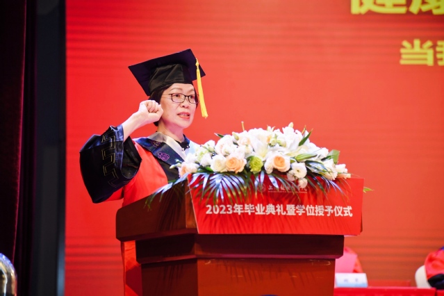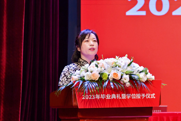 护理与健康管理学院谢吴鋆同学家长谢季红作为家长代表发言,她对学校的办学成果表示充分的认可和肯定,对学校领导及老师们的辛勤培育表示衷心的感谢和崇高的敬意,对全体毕业生表示热烈的祝贺和真诚的祝福。她希望即将走向工作岗位的同学们要用德才兼备的素养贡献于祖国的医疗事业,用自己良好的品格、精湛的医术在医疗事业中发光发热。