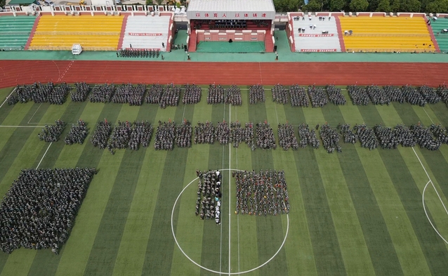 最后上场的是由400位同学组成的队列操方队,他们以“祝福校园致敬青春;铭记历史爱党爱国;伟大的中国航天”三个篇章为我们带来精彩绝伦的表演。通过展示校训“厚德至善,健行康民”、国旗、党徽、航天器等多种造型,彰显新一代健康人的时代风貌,传递了强国有我的铮铮誓言!
