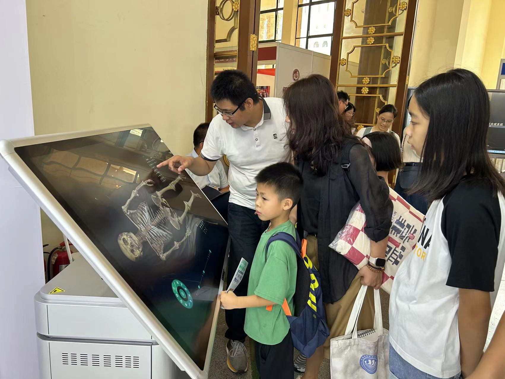 我校展厅位于西一馆二层D7,展厅全面回顾学校培养全科医生人才之路,全方位展示全科医生培育方面的特色实践与成果。学校高度重视学生实践教学工作,建设实践教学中心为学校所有本科专业提供专业性、综合性医学实践教学的平台基地,展厅以实践教学中心绘“身”绘“形”的教学特色为主线,以“人体”为载体,展现生命结构之美,引导同学们去观察、去思考、去实践,从而激发探索医学奥秘的兴趣。同时让观众更近距离感受医学的魅力,体会医学健康与自身生活的密不可分。展厅还特别策划了多个参与面广、互动性强的体验项目,包括高清数字人体验区,参观者通过手动对解剖结构的任意操作,模拟解剖训练,以及VR体验区让参展者通过最新元宇宙技术,了解基础医学知识、体验不同临床手术的模拟操作。参观者足不出现场,就能身处虚拟医学教室及临床手术室的环境,激发参观者对于医学的好奇心和学习热情,让参观者更加了解医学与计算机相结合的科技魅力,获得观众的惊叹与称赞。科技助力医学,也让观众近距离感受医学的魅力,开展首日即吸引了众多学生和家长前来驻足参观。