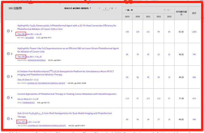 硫化铜肿瘤治疗领域文献被引用次数前5名,田启威占3篇,且单篇最高引用超千次