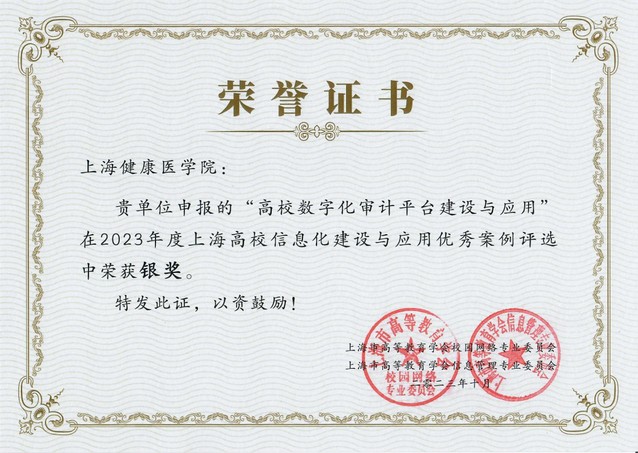 为更好地推进上海高校信息化创新建设与发展,树立应用典范,上海市高等教育学会信息管理专业委员会与上海市高等教育学会校园网络专业委员会于今年9月开展2023年度上海市高校信息化建设与应用优秀案例评选工作。学校图文信息中心和审计处联合申报的《高校数字化审计平台建设与应用》获评为上海市高校信息化建设与应用优秀案例银奖。