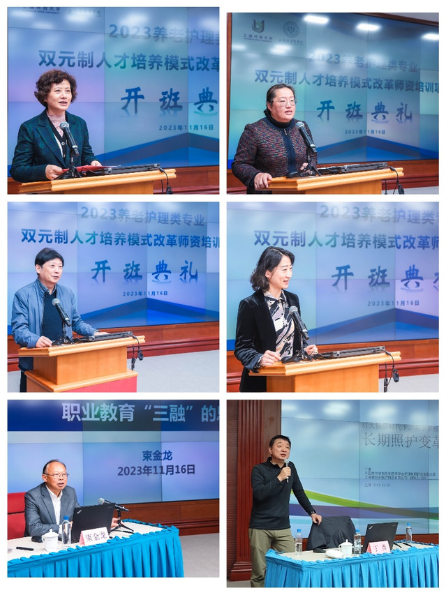 11月16日,在上海高校养老家政专业建设服务平台、上海市高职高专医药健康类专业教学指导委员会、长三角养老行业人才培养共享平台的支持下,由上海健康医学院联合上海开放大学共同举办2023年养老护理类专业双元制人才培养模式改革师资培训项目在上海开放大学顺利开班。上海开放大学副校长张瑾、上海健康医学院党委副书记、副校长唐红梅、上海市养老服务行业协会会长徐启华和上健医继续教育学院院长姚谷芳等出席开班仪式并致辞,会议由上海开放大学民生学院院长范军主持。