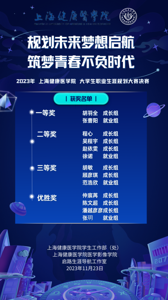 经过激烈的竞争和各环节的评比,根据参赛选手的现场展示和评审专家的综合评分,本次决赛共评出一等奖2名,二等奖4名,三等奖3名和优胜奖4名。获奖同学将进一步锤炼参赛作品,积极准备接下来的上海市职业生涯规划大赛。学校也将持续把大学生的职业生涯教育作为立德树人的重要环节,厚植大学生的家国情怀和责任担当,引导大学生坚定理想信念,树立正确的就业观、成才观、价值观,为健康上海、健康中国服务。