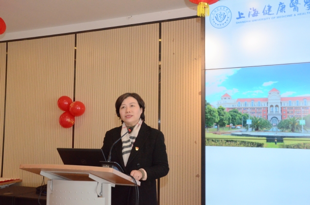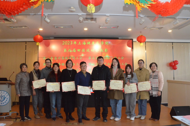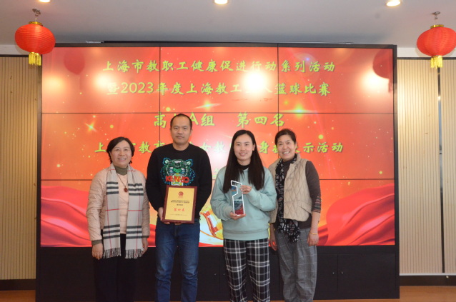 芦静宣读2023年下半年教职工参加上海市教育工会(妇工委)及学校各类活动的获奖集体:上海健康医学院第九届运动会教工团体前八名、2023年上海教工三人篮球第四名、2023年女教师健身操比赛第二名。凌文惠、芦静、郁建新为获奖的集体颁奖。