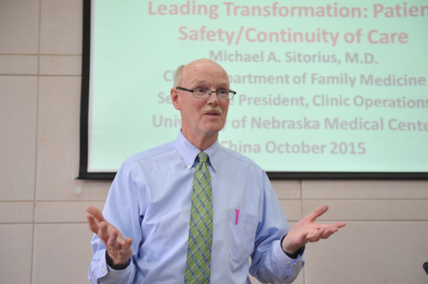 二位专家的讲座主题分别为‘Primary Care in the United States: Yesterday and Today’和 ‘Why Primary Care? Leading Transformation: Patient Safety/Continuity of Care’。讲座在初级医疗体系建设、人才培养目标、人才培养效益等方面为师生回顾了美国发展历程,为中国未来初级医疗保健模式建立提供了值得思考的借鉴。专家们通过美国基本医疗的一般情况,并以国民健康状态、基层医疗质量、分级医疗系统建设等指标为例对比了各发达国家的医疗服务效益,分析了初级医疗惠及状态,并引出了美国的医师培养制度和UNMC的相关课程情况。讲座以大量图文详细描述了初级医疗服务的特点、内涵和外延,并在讲座中贯穿始终的强调了初级医疗服务的延续性发展趋势、以人为本的健康维护观念。