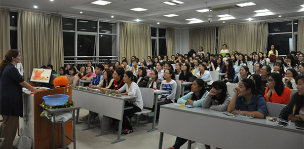 本次活动派出了由6名美籍教师组成的强大阵容,吸引了来自全校各学院150多名的同学参与其中,讲解、游戏、互动,妙趣横生。此次活动适逢西方节日—万圣节,外籍教师诠释了节日的来由和意义,讲解万圣节里的主要元素,并预备了糖果与同学们分享。虽然当晚气温骤降,但现场气氛却非常热烈。