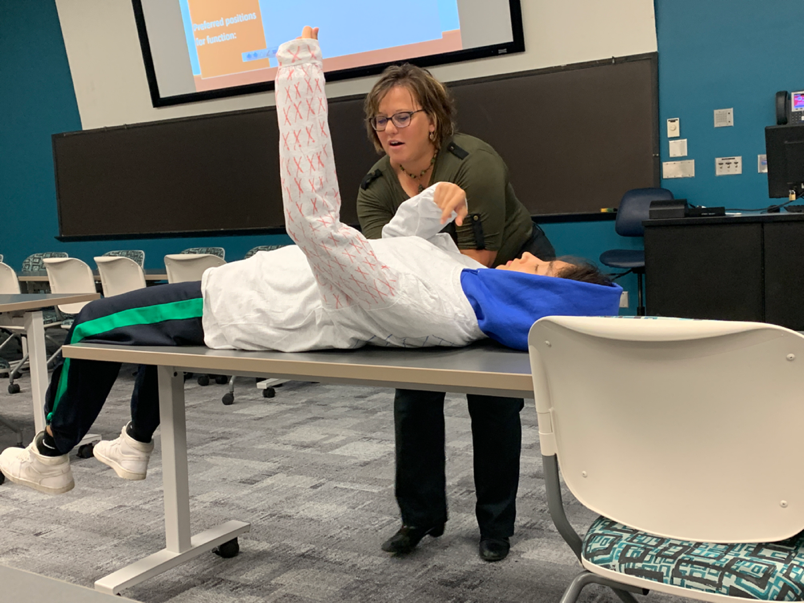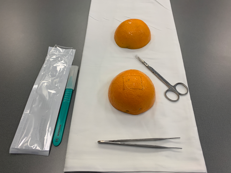 创伤管理课上,老师准备了很多件标有各类创伤的T恤让同学们穿上,大家通过亲身实践,体会不同体位对患者造成的影响。同学们还用橙子来练习如何切开伤口可以减轻患者的痛苦。