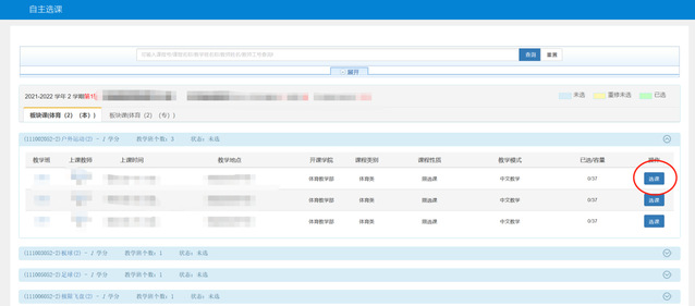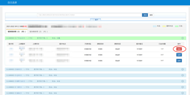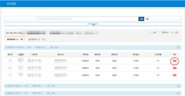 2.每位同学每学期限选1门体育俱乐部课程。选课为抢选制,每个时间段俱乐部课程先选先得,额满为止。选课完成后若需退课重选,可在选课时间范围内退课,超过选课时间一般不得退选、改选。