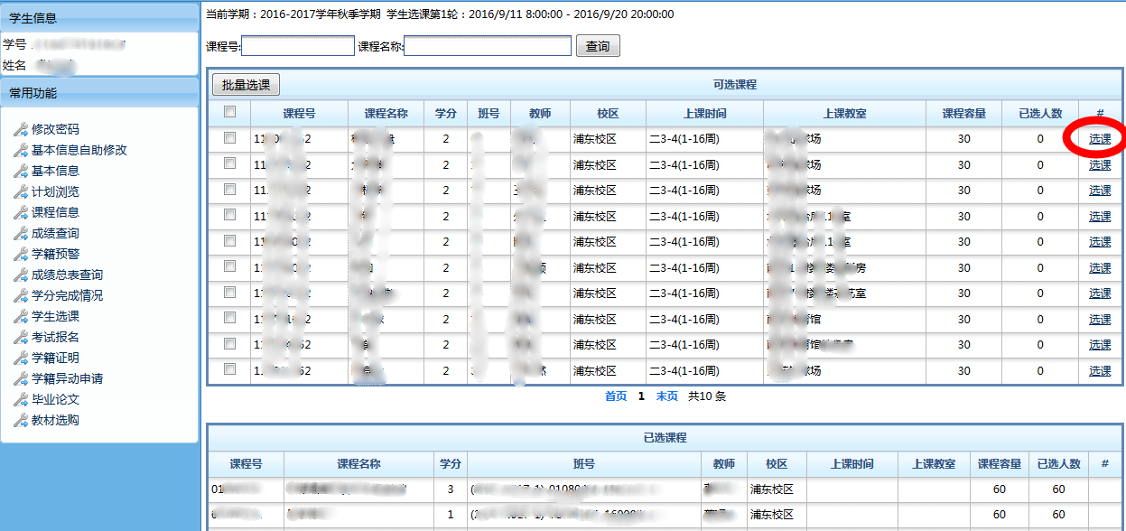 (三) 点击左侧菜单“学生选课”