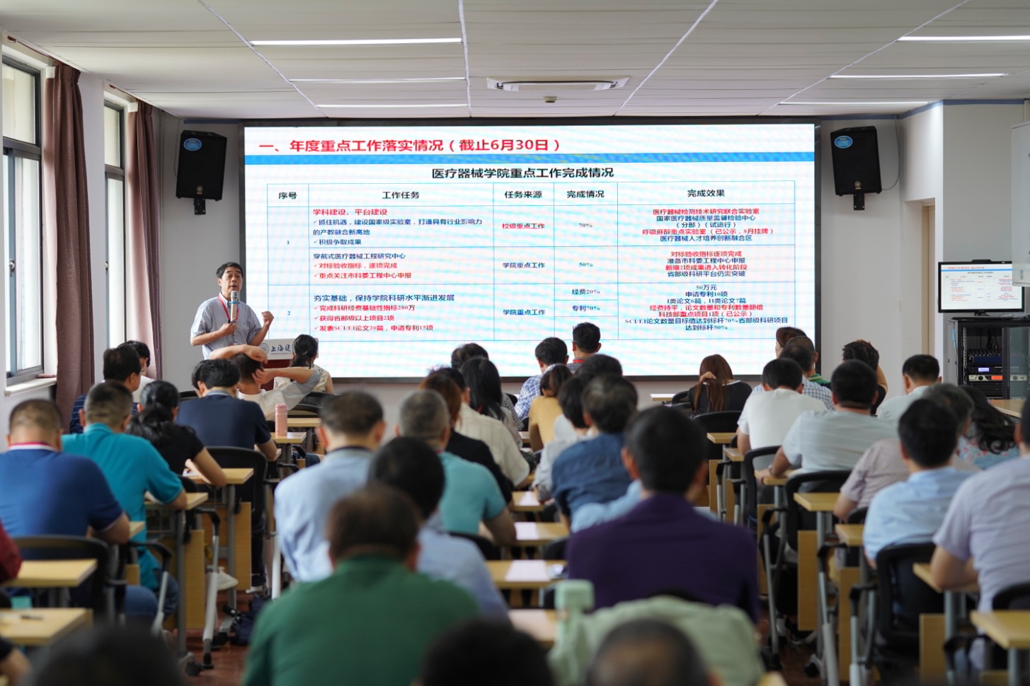 胡兆燕院长作了《2019年度上半年工作总结及下半年重点工作》报告,胡院长首先从学科建设、学术成果、师资队伍、教师岗位分类管理、学位评估、学生竞赛、国际合作、学生培养、产教融合等11个方面做了总结,详细介绍了各项工作完成情况和完成效果,接着对下半年工作进行了部署,强调学院下半年继续“以学科建设为龙头、以本科建设为重点、以医疗器械技术应用为特色、以教师岗位分类管理为抓手”,重点聚焦智能医疗器械研究和新工科背景下专业内涵建设,深入开展以内涵质量为核心的各类教学和科研活动,最后提出要求,希望全院教师加强学习,充分发挥主动性和创造性,为学院的发展贡献力量,顺利完成年初制定的工作计划。