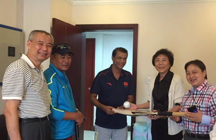 10月26日下午,于莹副校长和文理学院徐迪副院长,到海博楼慰问了中国板球集训队外籍主教练Rad hid khan先生。宾主进行热情洋溢的会谈。临别时,Khan先生向学校赠送了其本人签名的板球和球拍作为纪念。
