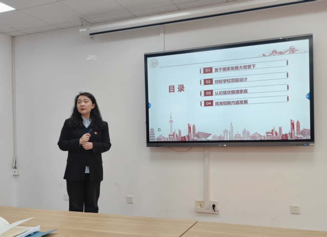 吕晓丽围绕“国家发展大背景、对标学校顶层设计、认识现状摸清家底、找准短板内涵发展”四个方面展开论述,深入学习贯彻习近平总书记关于教育、科技、人才等工作的重要论述,聚焦国家重大战略需求,围绕落实高等教育“两个先行先试”,对标学校顶层设计,认清学院现状,找准学院短板,推动学院内涵式发展。