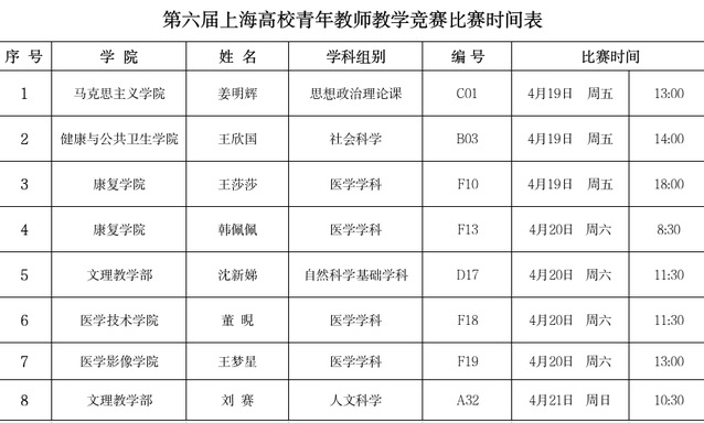 第六届上海高校青年教师教学竞赛于4月19日—21日举行。我校八位教师将参加人文科学、社会科学、思想政治理论课专项、自然科学基础学科、医学学科共5个组别的比赛,欢迎全校教师通过微信视频直播号收看现场直播,共祝他们取得好成绩!