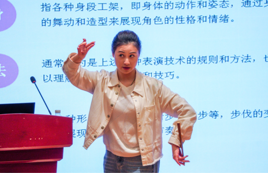 “昆曲有六百年的历史,被称为‘百戏之祖’。昆曲,作为中国传统戏曲的瑰宝,其独特的唱腔和表演艺术令人陶醉。它融合了诗词、歌赋、舞蹈、戏剧等多种艺术形式,展现出深厚的文化底蕴和艺术魅力。”罗晨雪老师以时间为线索,从昆曲的历史、昆曲的重大变革、艺术形式、表演形式等不同方面介绍了昆曲文化知识。由名角大师、昆曲之美讲述到四功五法,给观众带去了别样的美学展示。