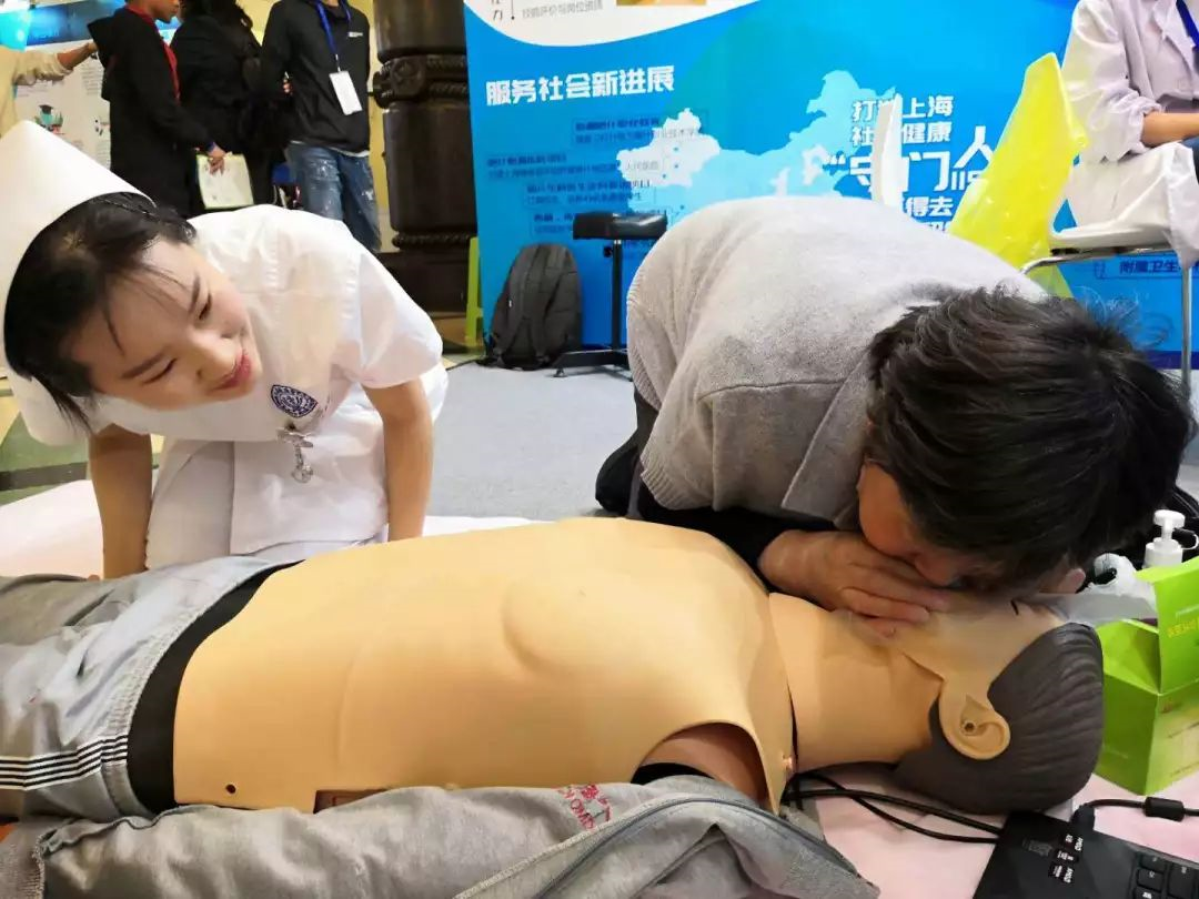 参观者从小学生、中学生到中老年,他们在志愿者现场指导下进行心肺复苏、测量血压等项目的演练,认真而专注。