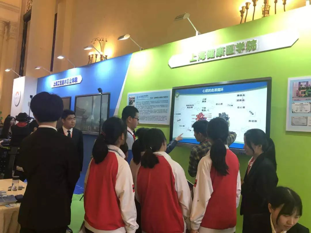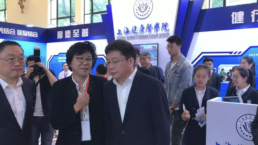 我校展位位于东展馆的中部,“代表中国潮流的上海健康特色走向世界”的鲜明主题映入眼帘。展位右侧的“应用型、特色性、国际化”格外醒目,应用型的定位高度契合了本届展览的主题。