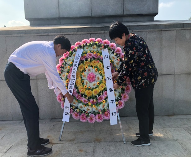 进入园区,迎面看到高耸的英雄纪念碑,全院党员肃然起敬。药学院党总支书记詹昌明和院长徐一新带领全院党员师生列队于英雄纪念碑前为革命先烈敬献花圈。全院党员在碑前集体默哀,寄托对烈士的哀思。随后,由詹昌明书记领誓,全体党员同志重温了入党誓词,表达对共产党的忠诚,对烈士的敬仰。