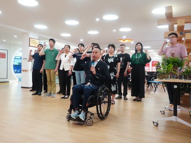 在宣誓教育环节,全国自强模范、上海工匠、区残联兼职副理事长柯水昌同志作为领誓人带领全体党员重温了入党宣誓。之后,党员代表们分享了他们的感悟,他们表示在今后的工作中一定要时刻铭记入党誓词,恪守党纪党规,清白做人,全心全意为人民服务。