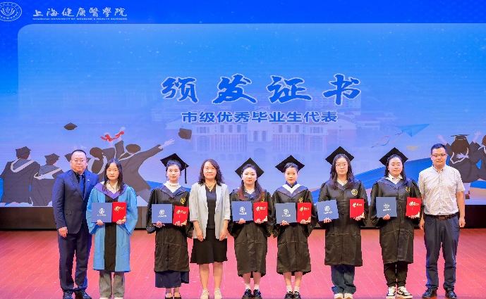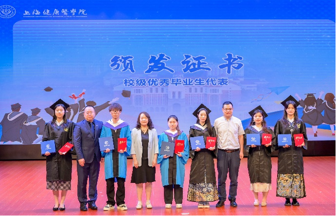 随后,学院为上海市优秀毕业生和上海健康医学院优秀毕业生代表颁发荣誉证书、毕业礼物并合影留念,激励大家迈着坚定的步伐,奔向明天的新征程。