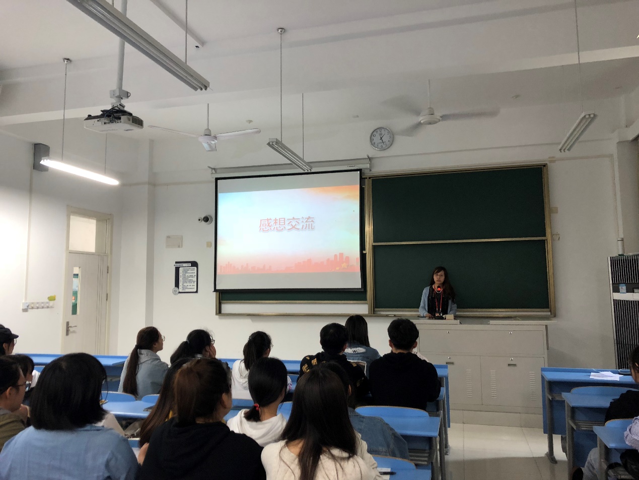 随后,各位入党积极分子结合自己的学习生活踊跃发言,交流心得。在大家心中,最大的感受就是自豪二字,为自己是一名中国人,更为自己是一名入党积极分子而感到无比自豪;很多人表达了对无数民族英雄崇高的敬意,纷纷表示一定要向这些先锋、英雄学习。积极分子代表包文怡说:“我直观的感受到了国家把“人民”二字提到了非常重要的高度,作为入党积极分子更加应该增强服务精神和参与精神,努力向优秀的党员模范靠拢,真正做到为人民服务。!”占纪云说:“70年风雨兼程,70年风云巨变,如今中国的发展建设取得了许多举世瞩目的成就,我为此感到十分的骄傲和自豪! 我们生在新时代,应当奋斗,为了中华民族的伟大复兴之梦而奋斗。让我们以只争朝夕的紧迫感,紧紧抓住同祖国、同时代一起成长的机会,肩负起推动中华崛起,实现伟大的中国梦!”。黄芩颖说:“让我很激动的是,在今天我看到一条新闻,我国已有七亿农村人口脱贫,不得不感叹祖国真的太强大了。还有一个细节是对于其中两个少年,我认为他们身上有着些许我们当代大学生的影子,我们同样会迷茫,同样会需要指导,但现今在学习了习近平新时代中国特色社会主义思想之后,我相信我一定会越发坚定信念,肩负起时代新使命!”