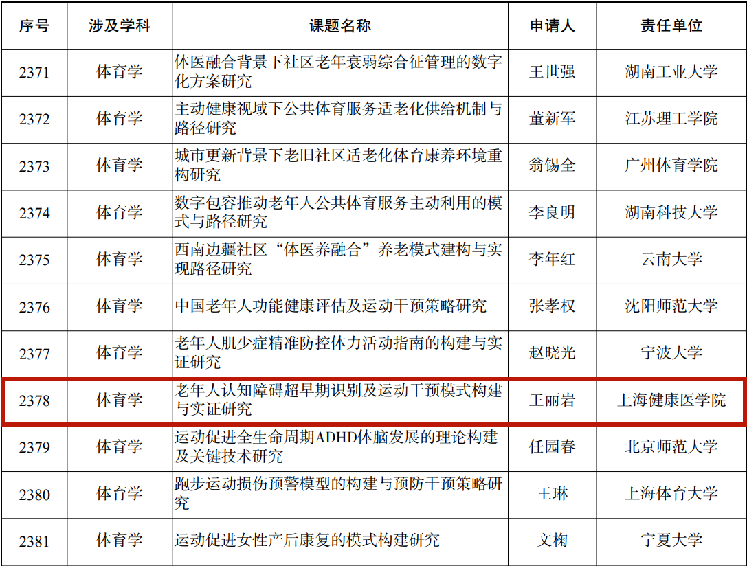 近日,全国哲学社会科学工作办公室公示了2024年度国家社科基金年度项目立项名单。我校康复学院王丽岩副教授主持的《老年人认知障碍超早期识别及运动干预模式构建与实证研究》成功获批立项,这是康复学院第一次获批国家社会科学基金项目,取得了零的突破。