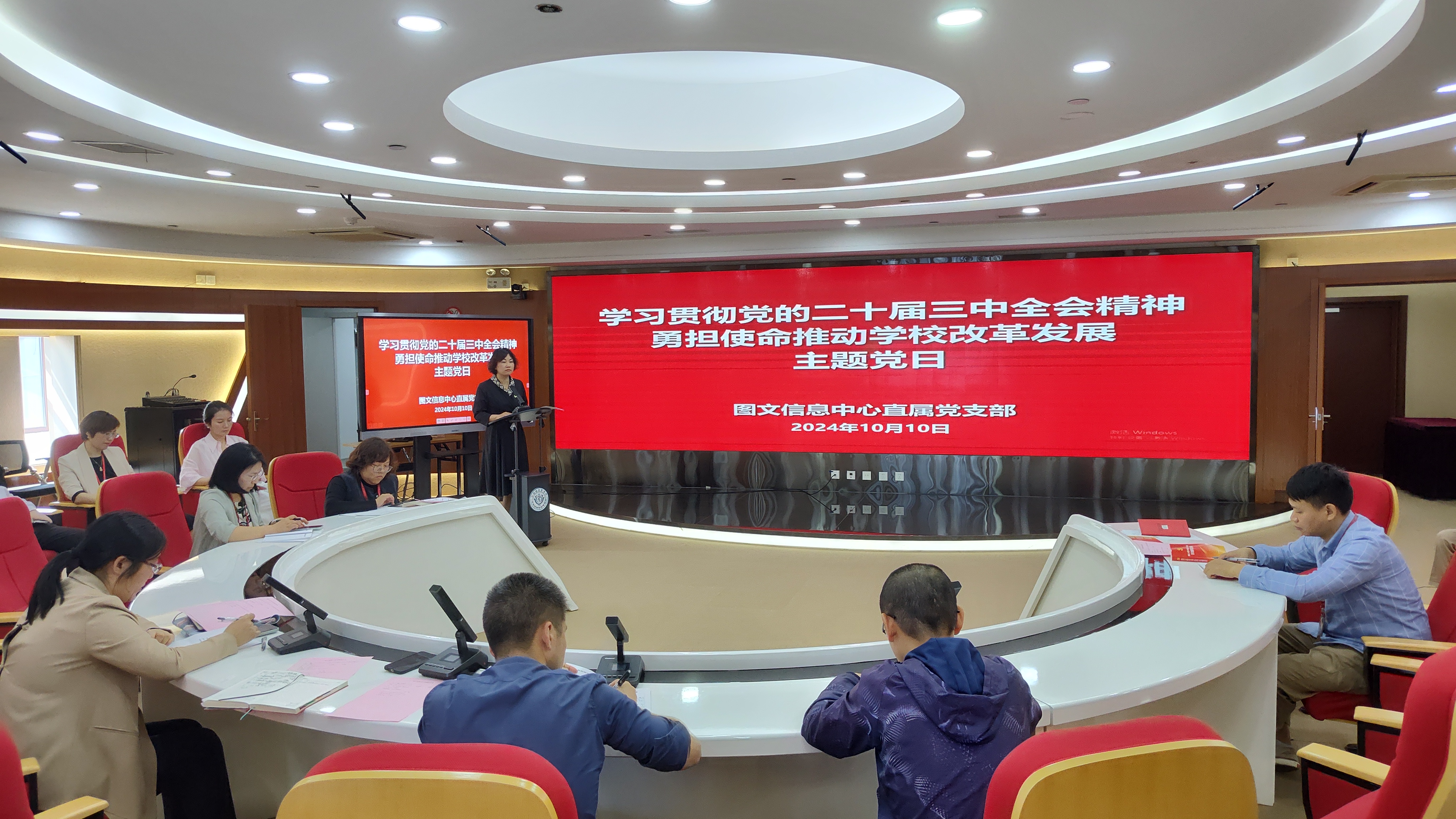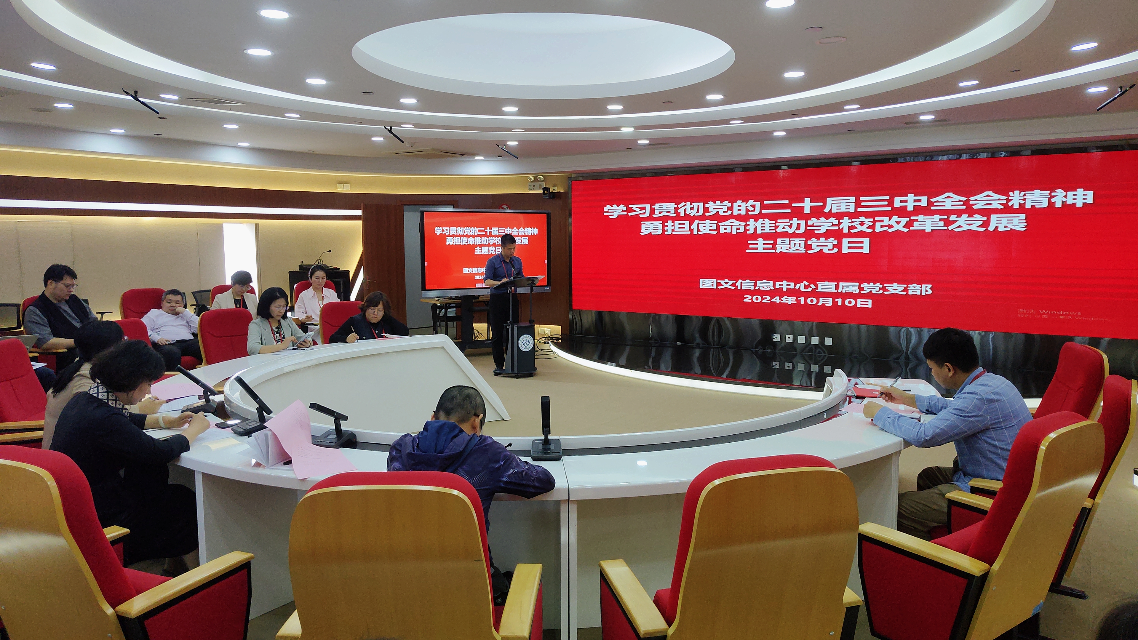 为深入学习贯彻党的二十届三中全会精神,聚焦新学期中层干部大会传达的上级精神和下半年工作部署,图文信息中心直属党支部于10月10日在南苑图书馆五楼报告厅开展“学习贯彻党的二十届三中全会精神 勇担使命推动学校改革发展”主题党日,深入学习领会相关精神。机关党总支副书记(主持工作)詹浩玲、图文信息中心全体教职工参加,本次主题党日由机关党总支副书记高晓霞主持。
