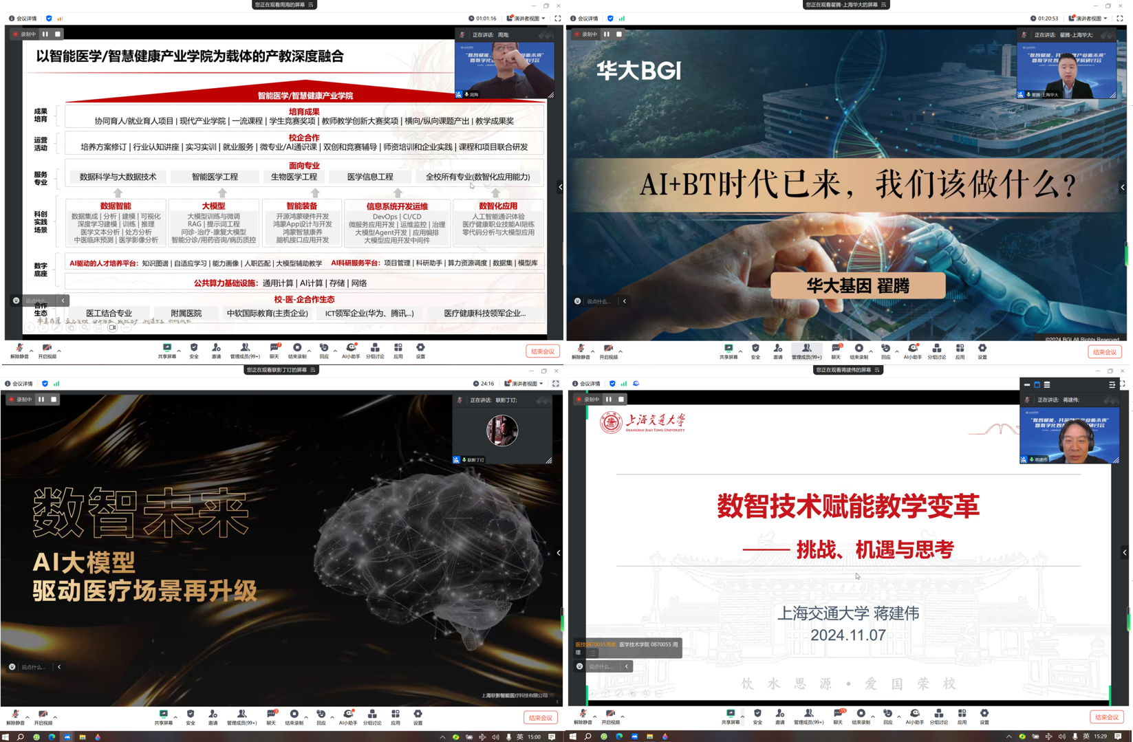 此次研讨会围绕数字智慧医疗及教学,邀请了中软国际教育卓越研究院院长周海、上海华大基因董事副总经理翟腾、上海联影智能医疗科技有限公司BD业务总监丁玎、教育部高等学校教学信息化专家蒋建伟等国内相关领域领军性行业专家,就新医科人才培养体系、AI时代下生物科学技术相关的变革趋势、AI大模型在医疗健康方向应用、AI场景下课程教学定位与实施等方面展开了深入的介绍,为与会老师们开拓了智慧医疗行业视野,了解了未来医学发展的新可能,为他们今后的数智教学和医工结合人才培养提供了更多的思路和方向。