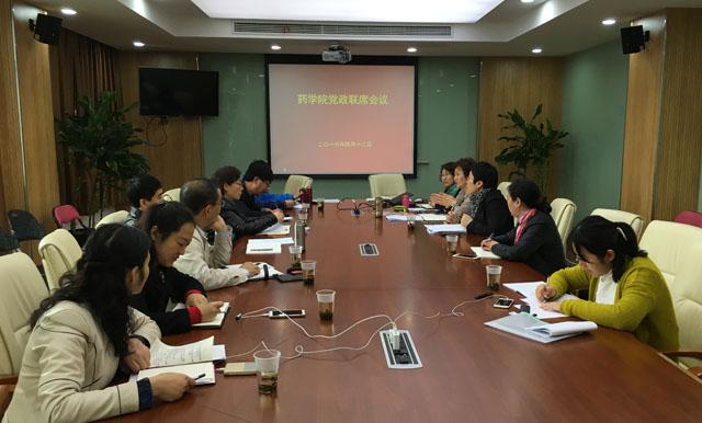 4月12日下午,校党委书记郑沈芳、副书记、纪委书记李明磊、党办、组织部负责人前来参加药学院党政联席会议,检查指导学院党政联席会议制度落实情况。学院全体党政班子成员参加会议,各联合党总支书记列席。