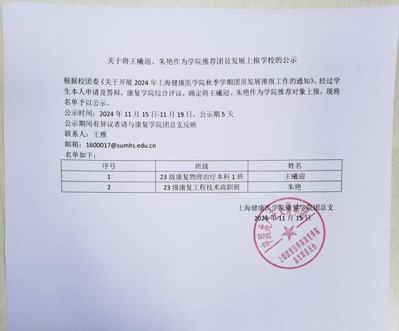 关于将王曦迎、朱艳作为学院推荐团员发展上报学校的公示