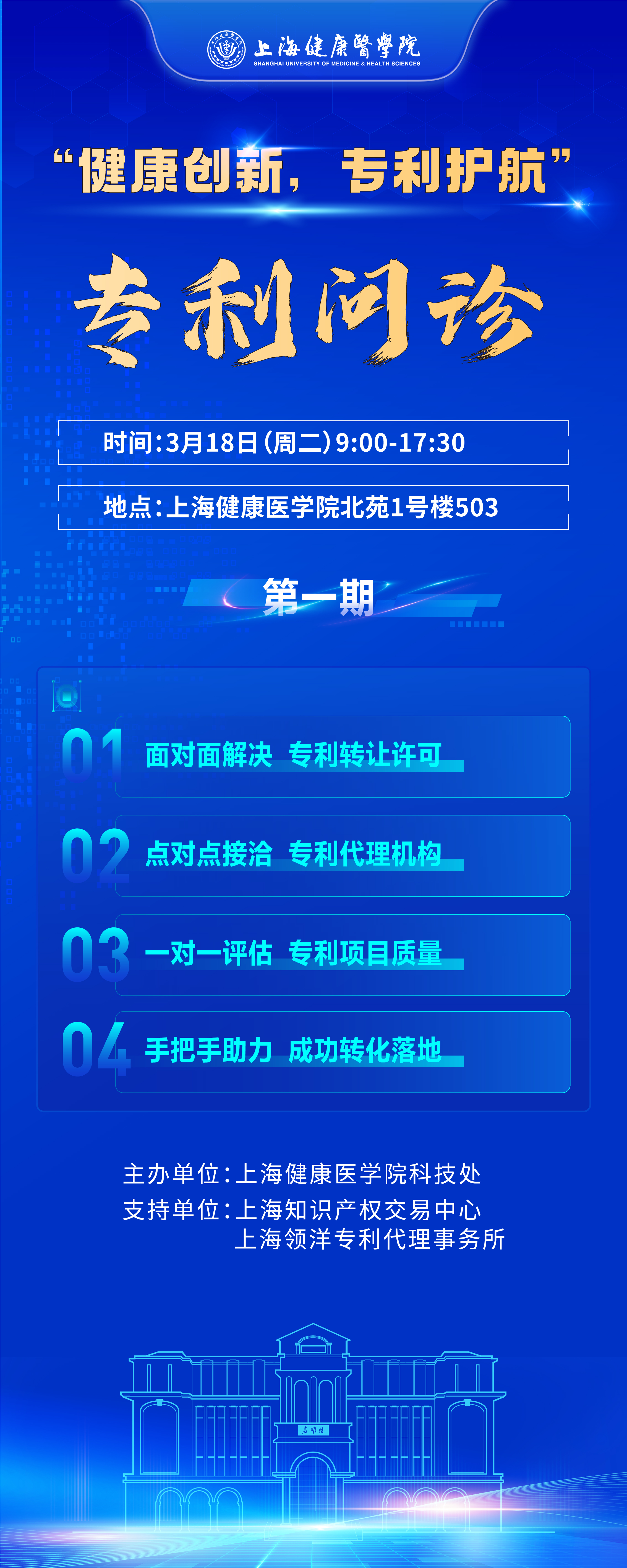 本活动定于每周二由国家知识产权运营(上海)国际服务平台及第三方专利代理公司工作人员在北苑1号楼503办公室开展现场“问诊”。