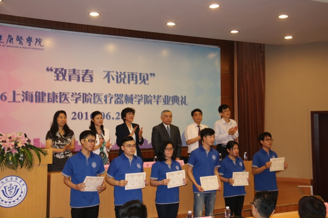 “多年师生情,今昔恨别离。满堂祝福语,只赠学子行”。6月28日中午,医疗器械学院2016届学生毕业典礼在杨浦校区报告厅隆重举行。上海健康医学院副校长于莹、大阪滋庆教育集团常务理事桥本胜信先生、医疗器械学院党政班子领导、专业主任、毕业班辅导员及2016届毕业生一同出席典礼。毕业典礼由副院长张欣主持。