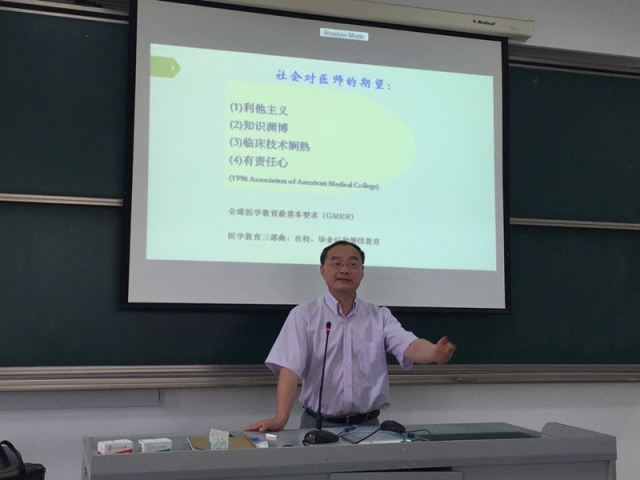 历时80分钟的2学时授课中,黄钢校长介绍了医师的职责,21世纪医学新目标,医学科学的发展趋势等内容,并强调呼唤医学人文的重要性。最后,黄钢教授寄予了学生们深切的期望,鼓励学生认识自己、规划自己、创造自己并成为自己。课堂气氛十分活跃,黄钢校长旁征博引,充满激情又不失幽默的讲课感染着认真听讲的每一位学生,充分调动了同学们对医学学习的积极性,同学们聚精会神的听讲并参与互动,本次课程是一堂深受学生欢迎并很有特色的大师授课。