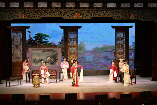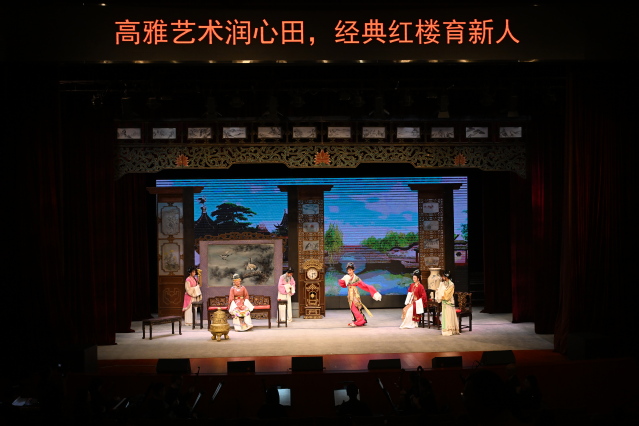 演出现场座无虚席,热烈氛围提前弥漫。伴随经典旋律响起,舞台大幕缓缓拉开,“钟鸣鼎食”的贾府风貌栩栩如生地展现在师生眼前。上海越剧院演员凭借精湛演技、婉转唱腔与精美舞台造型,将宝黛钗之间缠绵悱恻的爱情故事,以及封建家族的兴衰荣辱细腻铺陈。从“黛玉进府”的初见之喜,到“共读西厢”的知己情深,再到“黛玉葬花”的悲戚婉转,直至“金玉良缘”的命运错配与“宝玉哭灵”的痛彻心扉,一个个经典桥段被演绎得淋漓尽致,深深牵动着在场每一位师生的心弦。