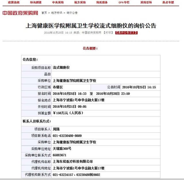 上海健康医学院附属卫生学校流式细胞仪询价公告
